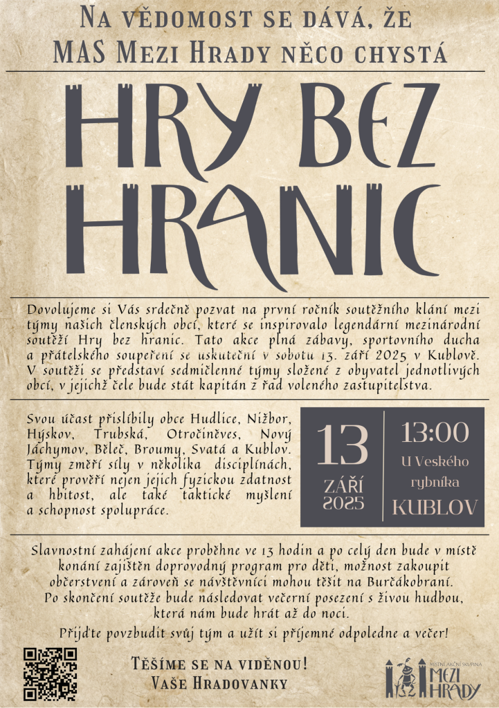 MAS Mezi Hrady z.s. pořádá dne 13.9.2025 od 13:00 u Veského rybníka v Kublově akci Hry bez hranic. Více informací viz plakát.