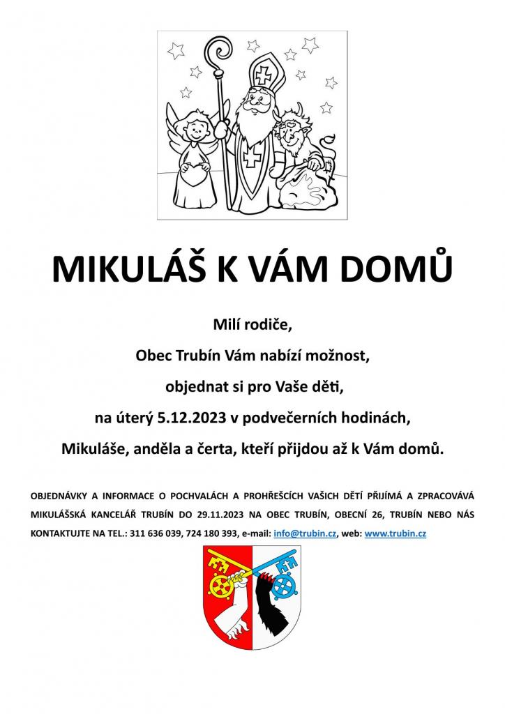 OBJEDNÁVKY A INFORMACE O POCHVALÁCH A PROHŘEŠCÍCH VAŠICH DĚTÍ PŘIJÍMÁ A ZPRACOVÁVÁ MIKULÁŠSKÁ KANCELÁŘ TRUBÍN DO 29.11.2023 NA OBEC TRUBÍN, OBECNÍ 26, TRUBÍN NEBO NÁS KONTAKTUJTE NA TEL.: 311 636 039, 724 180 393, e-mail: info@trubin.cz, web: www.trubin.cz