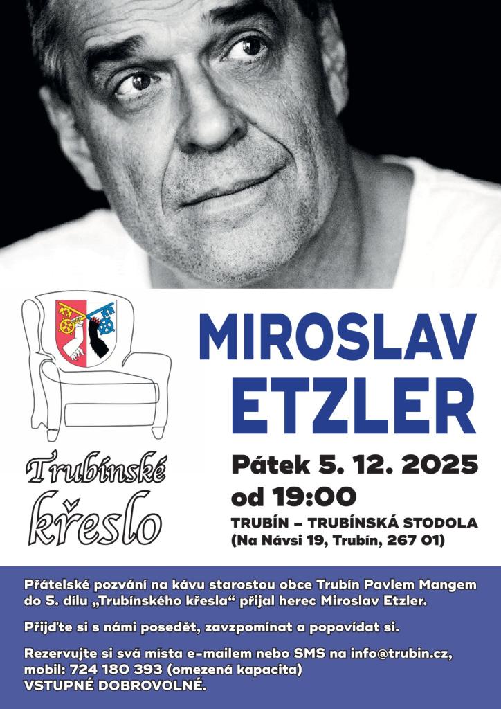 Přátelské pozvání na kávu starostou obce Trubín Pavlem Mangem do 5. dílu "Trubínského křesla" přijal herec Miroslav Etzler.